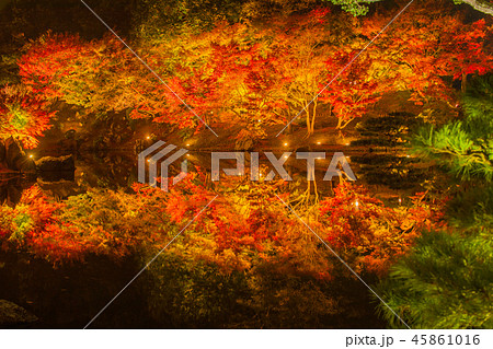 特別名勝「栗林公園」ライトアップされた紅葉の南湖(楓嶼と楓岸と根上り五葉松)