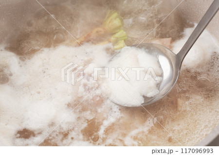 タイ料理・カオマンガイの調理シーン(灰汁取り)