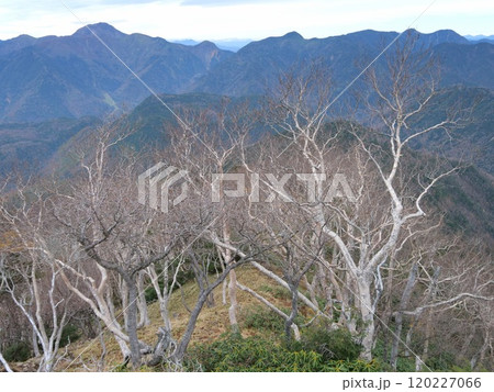 群馬県栃木県 県境 ぐんま百名山 温泉ケ岳山頂から根名草山方面 縞枯れ現象が見える 避難小屋も見える
