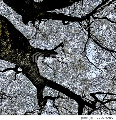 岐阜県本巣市の満開の淡墨桜二世の木の下から空を見上げて