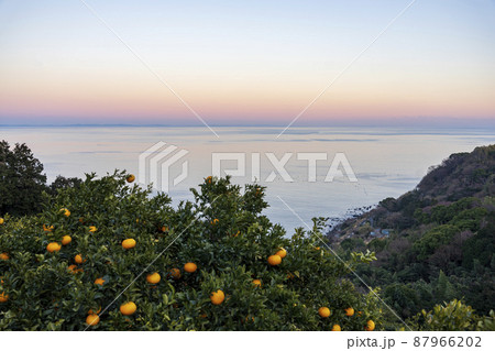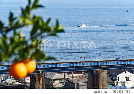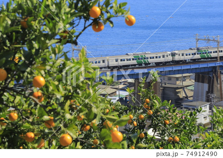 相模湾が見えるみかん畑を行く東海道線の普通電車