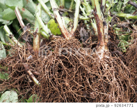 コブが抱くさんついているインゲン豆の根っこ