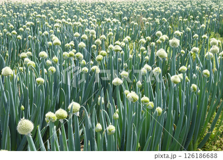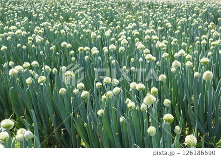 初夏の採種用のネギ畑 初夏の葱坊主