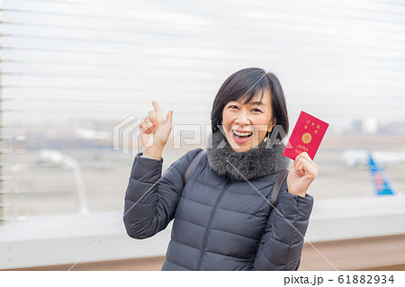 展望デッキでパスポートを手にし旅行旅行を楽しみにするミドル女性