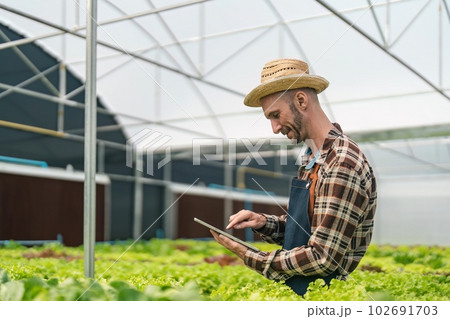 Hydroponics vegetable farm. male farmer checking vegetables from his hydroponics farm, concept of growing organic vegetables and healthy food