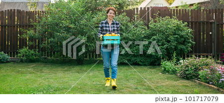 Banner Farmer woman holding wooden box full of fresh raw vegetables copy space and empty place for text. Basket with vegetable cabbage, carrots, cucumbers, radish, salad, garlic and pepper in female