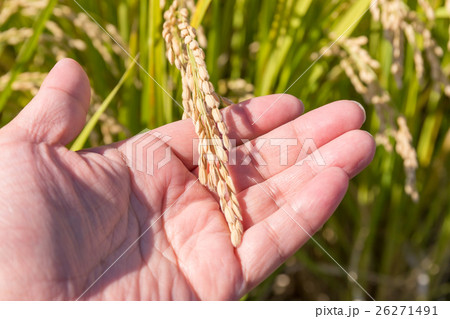 黄色に色づく稲穂の粒を手を添えてチェックする男性 (9月) 生産管理 農業