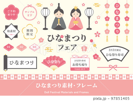 ひな祭り・ひな人形のイラストとフレームセット。ひなまつり、桃の節句、3月のイベント、日本の伝統行事。