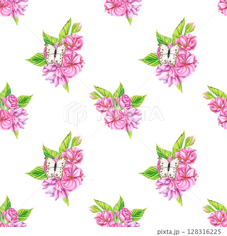 Pink flowers with a butterfly Seamless Pattern. Watercolor botanical background of Pink cherry blossom flowers. Pattern with flowers botanical illustration. Botanical wallpaper of flowers for designs