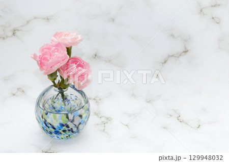左配置の寒色の一輪挿しにピンクのカーネーション3輪(横構図)