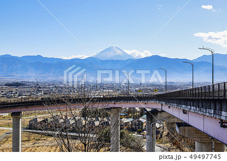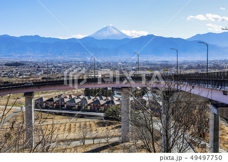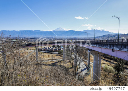 山梨県南アルプス市の桃花橋公園からのぞむ富士山とループ橋