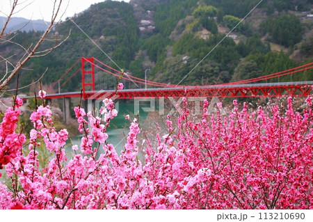 ハナモモと仁淀川に架かる寺村橋 (高知県 仁淀川町)