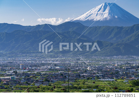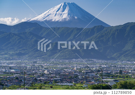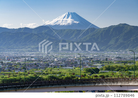 《山梨県》富士山と新緑の甲府盆地の風景・南アルプス市桃花橋公園の眺望