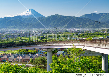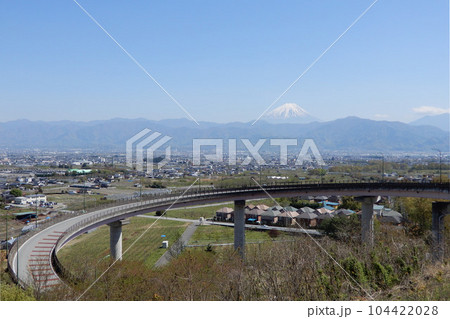 山梨県南アルプス市の桃花橋公園からのぞむ富士山とループ橋