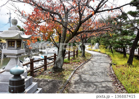 桑名市 歴史を語る公園の東屋と散策路と紅葉