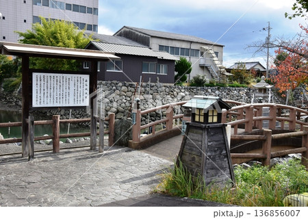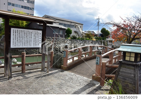 桑名市 歴史を語る公園の日本橋と案内板と紅葉