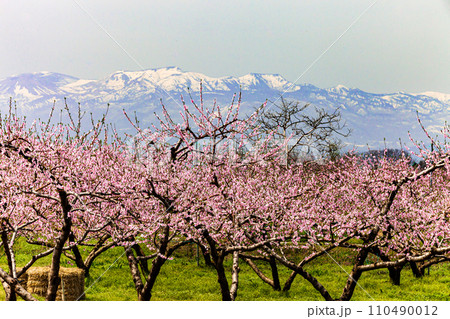 【福島県・桑折町】桃の花と残雪の吾妻連峰 4月