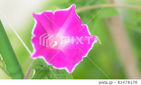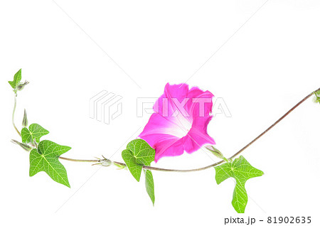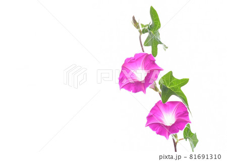 真っ直ぐ伸びたつるに咲くアサガオ二輪 白バック