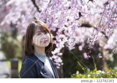 京都府京都市の鴨川沿いの枝垂れ桜を背景にしてる若い女性