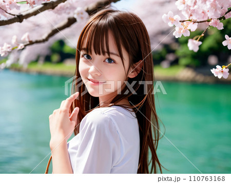 AI画像 満開の桜の公園で笑顔を見せる若い女性