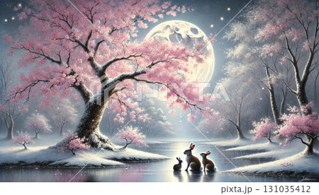 大きな満月と咲き誇る桜の木の下で兎たちが佇む幻想的な雪景色のファンタジー風景
