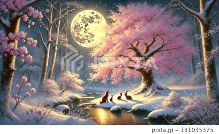 雪に包まれた満月の夜、桜の木の下で寄り添うキツネとウサギたちの幻想的な冬景色