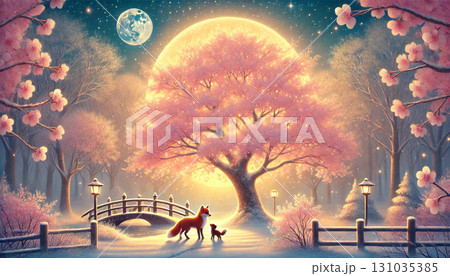 満月に照らされる桜の木と橋と狐親子が描く幻想的でロマンチックな冬の夜景イラスト