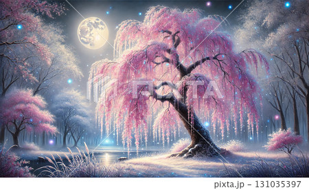 満月に照らされ輝く湖畔のしだれ桜と雪景色が幻想的に広がる美しい夜の絶景イラスト