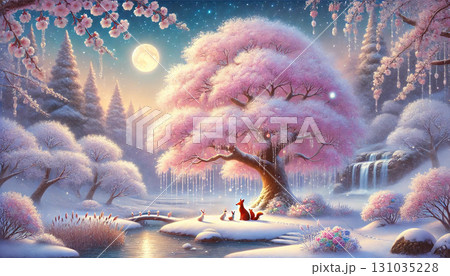 満月の下で桜と雪景色に包まれた滝と川辺に集う動物たちの幻想的で心温まる風景