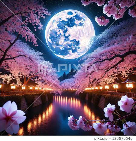満月と桜の花びら – 月光が優しく照らす幻想..
