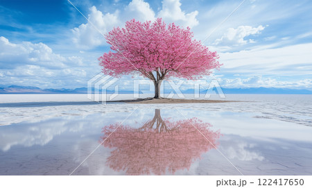 桜とウユニ塩湖が織りなす夕焼けの調和
