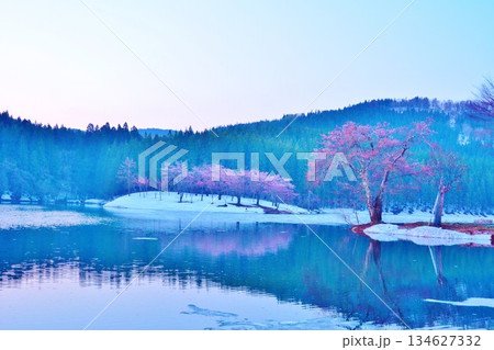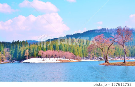 早春残雪に咲く新潟県十日町市津南町中子池の桜