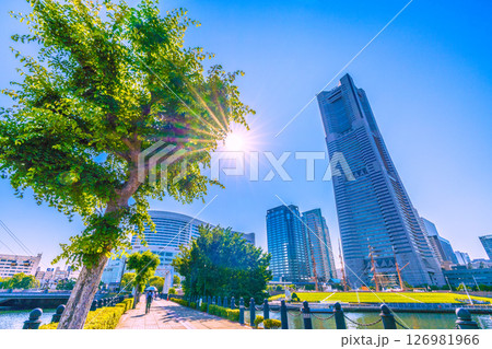 日本の横浜都市景観 夏のような日差し…汽車道の港一号橋梁や横浜ランドマークタワーなどを望む=6月5日