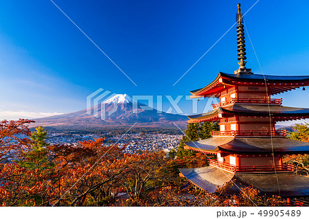 (山梨県)桜紅葉した新倉山浅間公園、忠霊塔と新雪富士