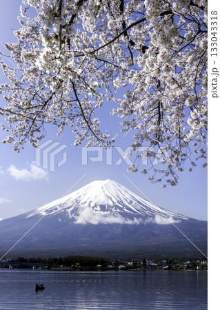 Fuji Mountain and Sakura Branches at Kawaguchiko Lake with blue Sky in sunny Day