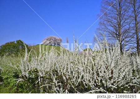 さきたま古墳公園内に咲くユキヤナギと墳丘頂に桜咲く丸墓山古墳