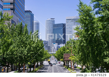 名古屋都市風景 桜通の銀杏並木と名古屋駅ビル群 ニュータス 丸の内歩道橋から
