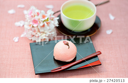 春の和菓子、桜まんじゅう/桜饅頭と緑茶のイメージ。注意)背景の桜は造花です。