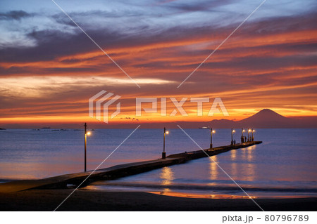 凄い夕焼けのレトロ桟橋と富士山 原岡海岸