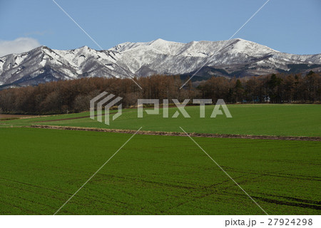 北海道今金町の秋まき小麦の緑の芽が出た畑とバックに残雪の山を配して撮影
