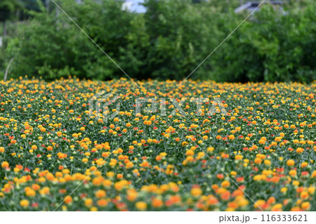 満開のベニバナ畑の風景 (埼玉県・桶川市)