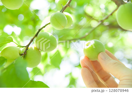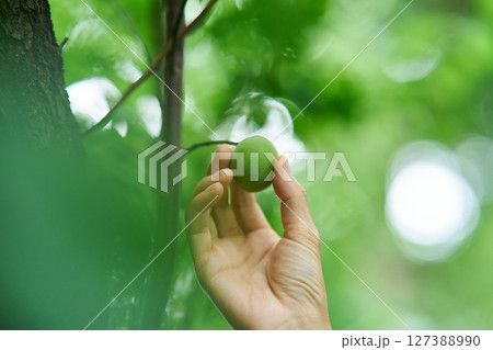 梅の実をもぎ取る