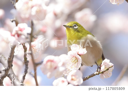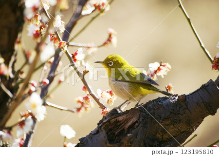 梅の花の蜜を吸うメジロ ウメジロー 白梅