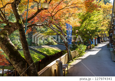 苔むした屋根の川床が並ぶ高雄観光ホテルと、錦秋の紅葉が美しい景色。京都市右京区, 京都府, 日本