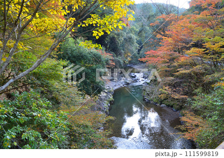 2021年11月の早朝の清流清滝川の紅葉が幻想的で美しい