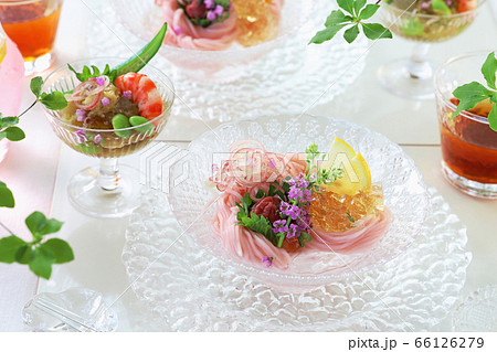 爽やか梅そうめん ガラス皿に個別に盛り付け 夏野菜の炊き合わせ