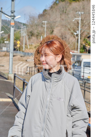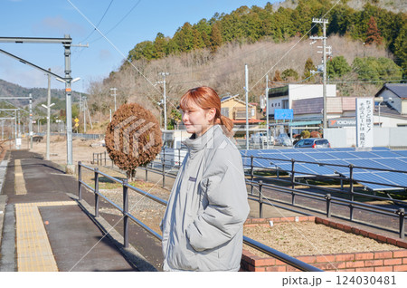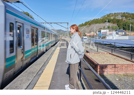 駅のホームで電車を待つ女性 田舎