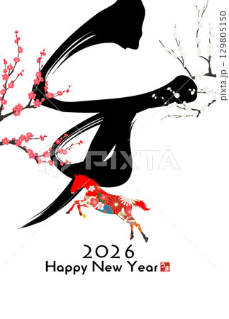 2026午年 馬と梅の花のおしゃれな年賀状 白背景