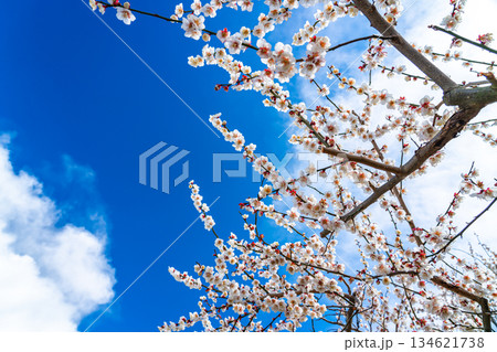 春の青空に映える真っ白な梅の花の満開風景