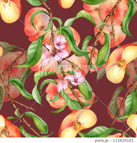 Watercolor branch of peach tree with fruit and flowers seamless pattern isolated on dark. Fig peaches and leaves painted. Chines peaches hand drawn. Design element for package, skin care cosmetic
